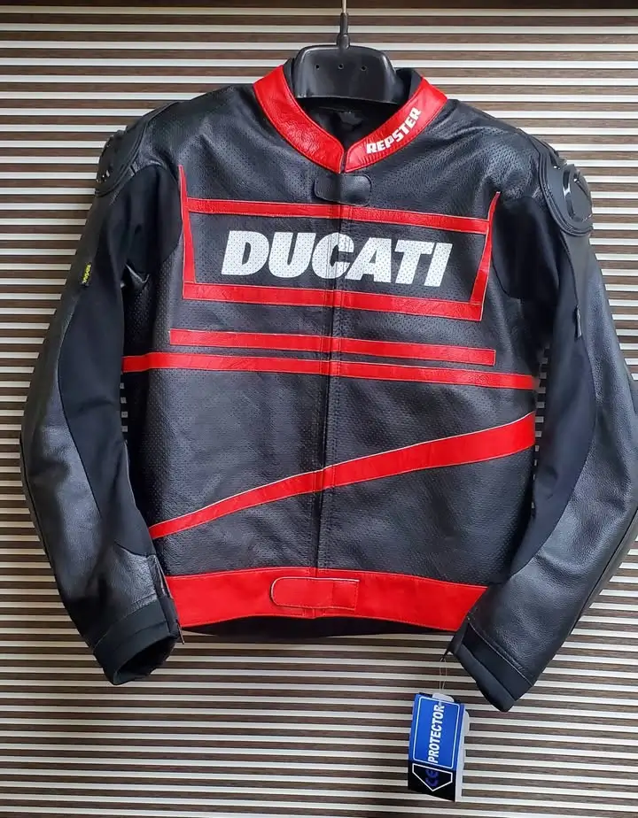 - This Ducati racing jacket has external CE-approved elbow sliders.